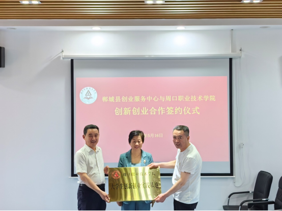 双方签订共建大学生创新创业实践基地协议书,李秀萍为实践基地授牌。