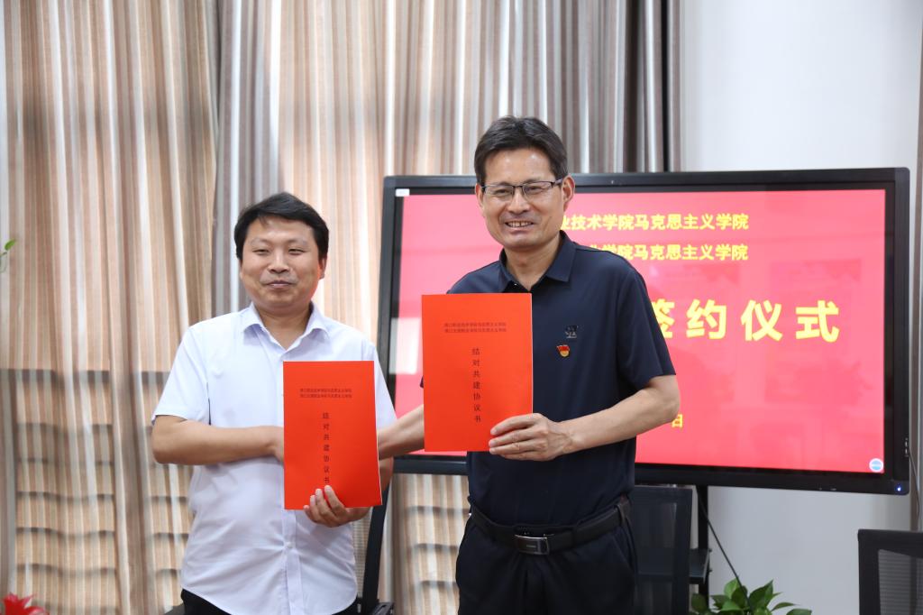 贾涛从领导重视、加强保障、实践教学建设、思政队伍建设等方面介绍了马院的建设情况,并希望双方在学院建设方面能够优势互补,共同进步。李翔从师资队伍建设、课程建设等方面详细介绍了周口文理职业学院马院的发展情况,并表示期待两院的合作。随后,两校马院院长签订共建协议,开启两校马院合作共建新征程。
